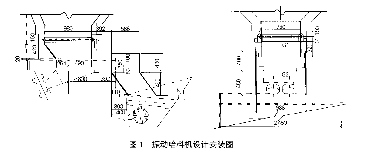 ZGB- 300振动给料机,振幅6一8 mm、电机YZO一17一4.2 X 0. 75 kW、振动频率1 450 r/min、振动力2X15kN、额定电流2X1.8A、处理能力为100~300 t/h,它主要用于处理20 mm以下的矿物,振动给料机原设计安装见图1;