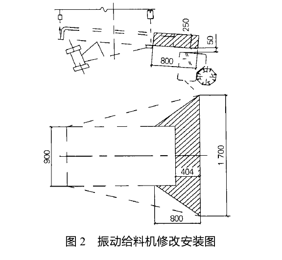 在现场的安装过程中,振动给料机排料端底边述矿石的粒度组成,考虑含水率等矿石性质,设计选用2台ZGB- 300振动给料机。至筛子上边框高只有280 mm,振动给料机宽900mm,筛子宽2450 mm,如果物料经过原设计的漏斗给到筛面,物料扩散到整个筛面需要一定的行程,这样就会影响筛子的筛分和洗矿效果,如果振动给料机设计成一个扩散的喇叭型或者给料机宽度接近筛子宽度,筛子就能得到有效的利用。基于现场的情况,对振动给料机排料端进行了加长和扩宽改造,使物料能在给料机上得到有效的扩散,振动给料机修改安装如图2所示。