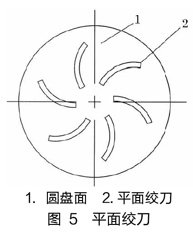 当煤泥之间的粘结力较大,其安息角已大于50°时,活动套筒高度调整对生产能力的改变已不明显。因圆盘结构限制,套筒内并不能装配置垂直方向的绞刀装置,为此,只能在圆盘面上加装如图5所示的平面绞刀,其主要目的是要把位于活动套筒下方的物料推向圆盘面的四周,并被刮料板所触接到。由于受刮板位置的限制,圆盘面上的平面绞刀并不能靠近圆盘边缘,因此撒料效果受到一定的限制。从生产现场的使用效果来,并未能满足生产能力要求。