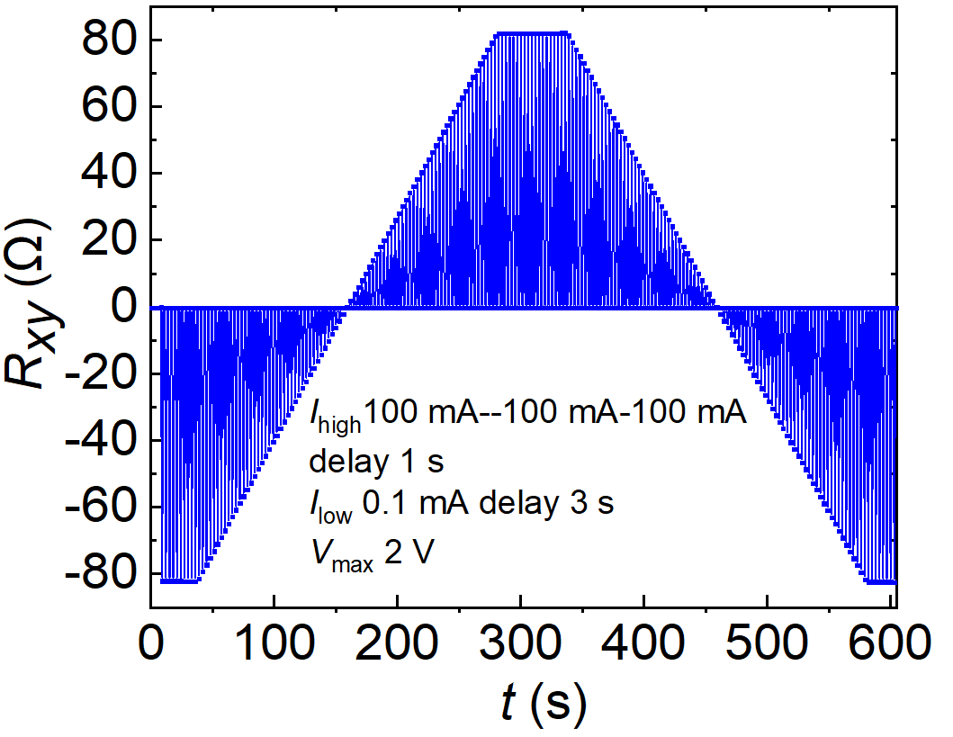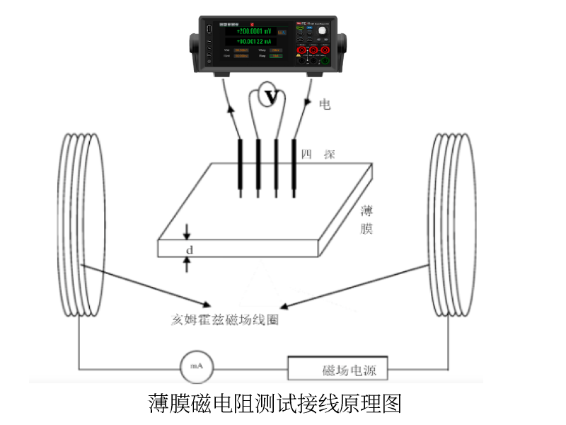 ITECH某材料领域用户需要进行薄膜磁电阻的电阻率测试,在这个测试中首先需构建变化的磁场,再向待测磁电阻输入高精密恒流源,利用四探针法测试薄膜磁电阻的磁阻及磁电特性。恒流源需以1mA恒流输出,分辨率1nA。还需要有脉冲扫描功能,高电平从100mA扫描到-100mA,低电平为0.1mA。这要求恒流源电源需要有高分辨率高精度以保证测试的精准及稳定、正电流到负电流的连续稳定扫描功能。用户选择IT2800高精密源测量单元完成这个试验,测试原理如下图。