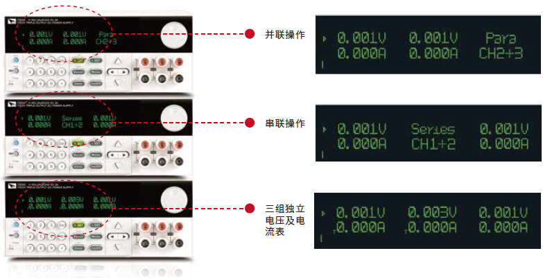 ♦ 二/三路可同时显示电压、电流值