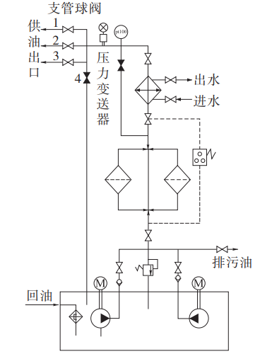 磨机正常生产运行时阀5全部打开,由于各支路调压装置的作用,油路上压力始终维持在自控系统允许值,油站正常工作。当需要对油箱内油进行加热或更换油液,油站运行在内循环状态时,打开阀4同时关闭阀5即可实现,此时压力变送器显示压力为0,无主机运行许可信号,磨机受油站控制保护不能开机;恢复油站正常运行,只需对阀4和阀5相反操作即可。