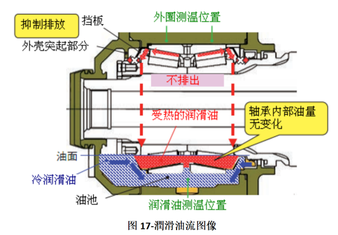 轴承内部受热润滑油的排出受到了挡板或外壳突起部分的阻碍,由于没有循环到油池,所以外圈的升温量没有降低到与现有产品相同的水平,可以认为是润滑油的温度降低了(图17)。另外,由于外圈升温量没有变化,推测轴承内部搅动的润滑油量没有变化。