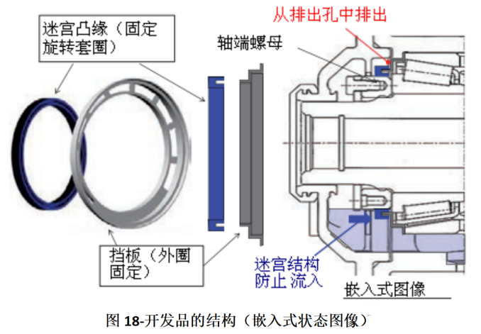 另外,在外圈外径面安装挡板,在套圈旋转侧(轴端螺母)设置迷宫凸缘,用这两部分构建迷宫结构(图18)。