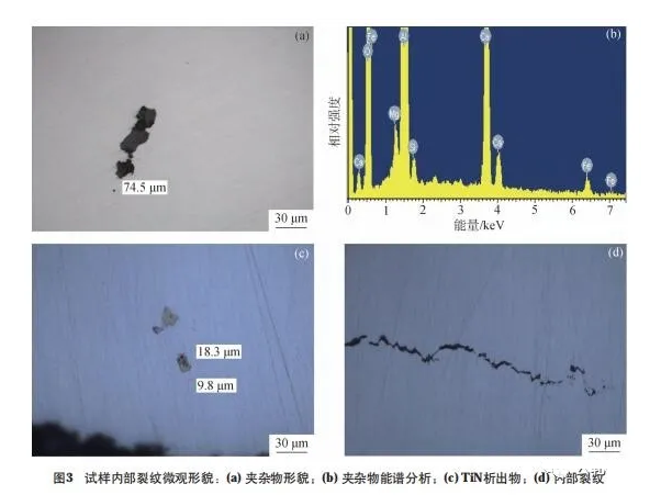 对剥落事故轧辊进行取样分析,轧辊剥落疲劳源、疲劳断裂区、瞬时断裂区宏观形貌及金相制样位置如图2所示。试样机加工后经体积分数为4%的硝酸酒精溶液腐蚀,观察试样夹杂物及用扫描电子显微镜能谱仪分析,试样内部及裂纹附近发现颗粒状Al2O3夹杂物及TiN析出物,夹杂物尺寸74.5μm,TiN析出物尺寸18.3μm。试样夹杂物、析出物及内部裂纹微观形貌如图3所示。