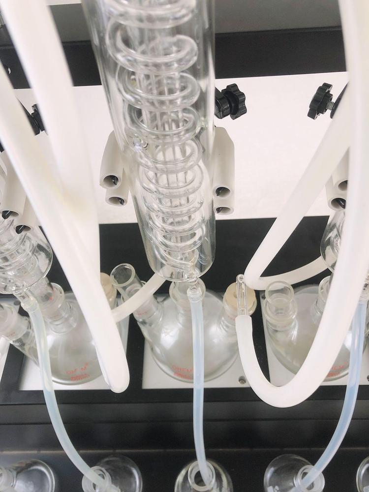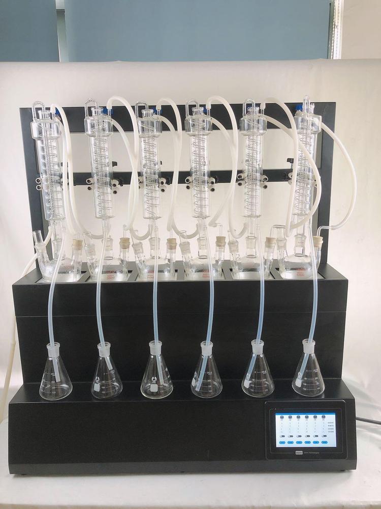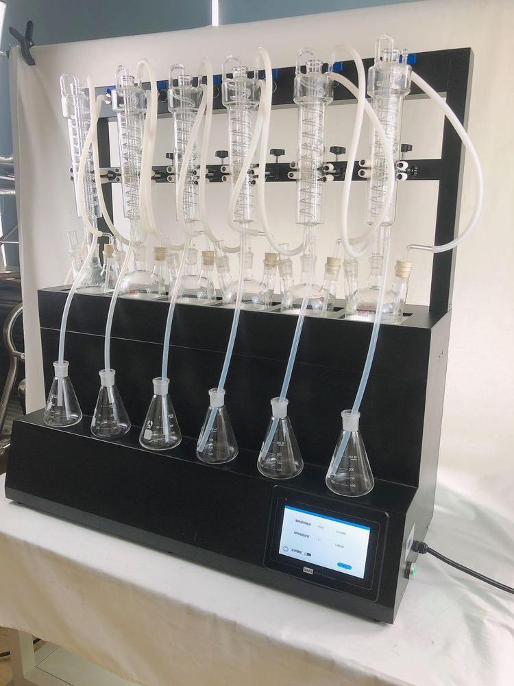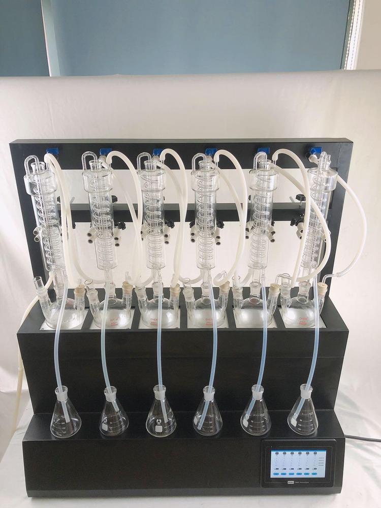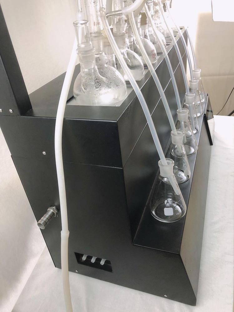 技术参数 Technical parameters 1、加热方式:采用远红外陶瓷加热炉,红外线辐射加热(无明火加热、防水2、加热单元:6个,可单孔单控制;3、升温时间:5-8min;4、蒸馏速度:12ml/min;5、蒸馏终点控制:自动侦测蒸馏终点功能,采用称重和时间双重控制,蒸馏体积控制在±2ml之内,自动化程度高;6、单炉加热功率:0-450W(单孔可调);7、加热功率:0-2700W(可调);8、冷却方式:封闭式内循环回流系统,无需外接冷却水源;9、防倒吸:设有防真空电磁阀,具有防倒吸功能;10、时间控制:0-200min可调;11、蒸馏瓶规格:500mlX6,250 X6 更多规格可选;12、额定电压/频率:220V/50HZ;