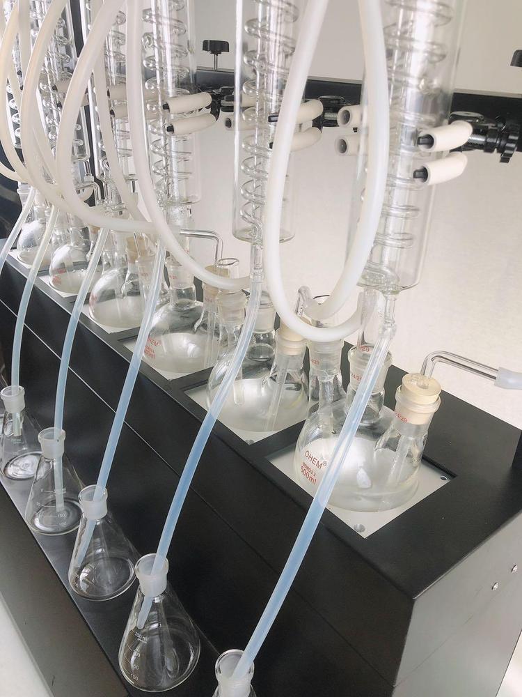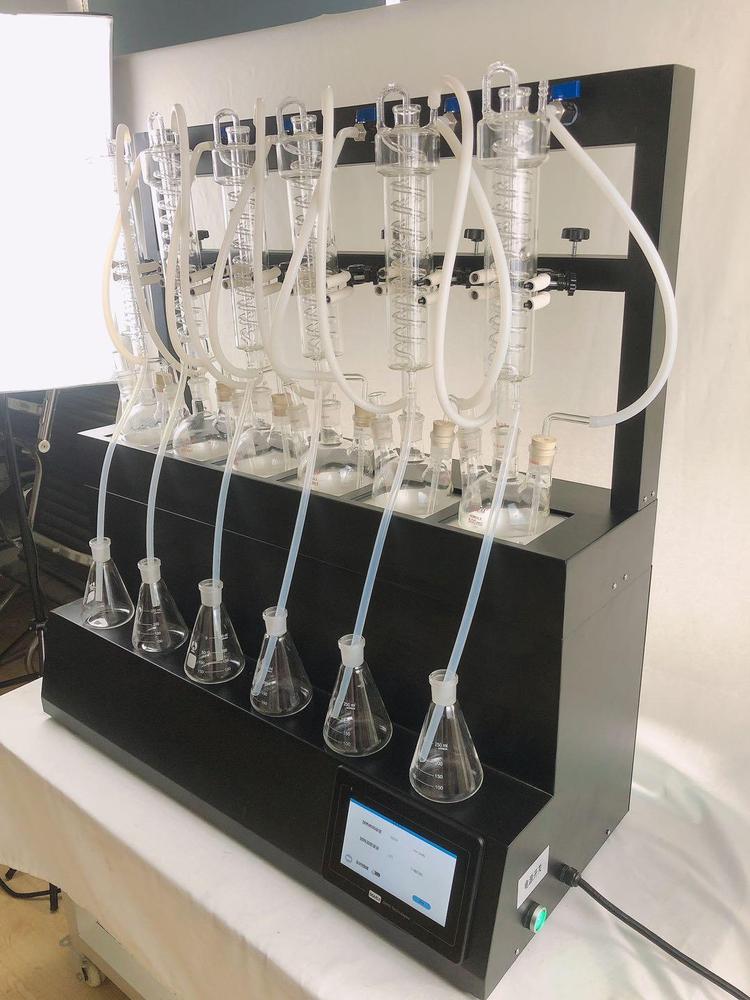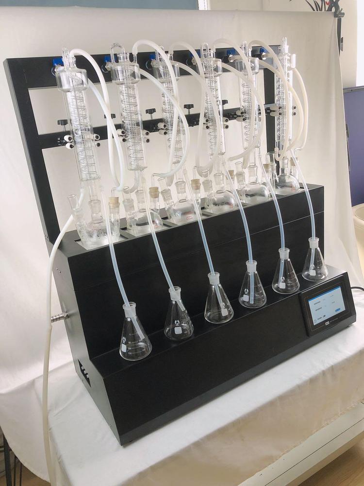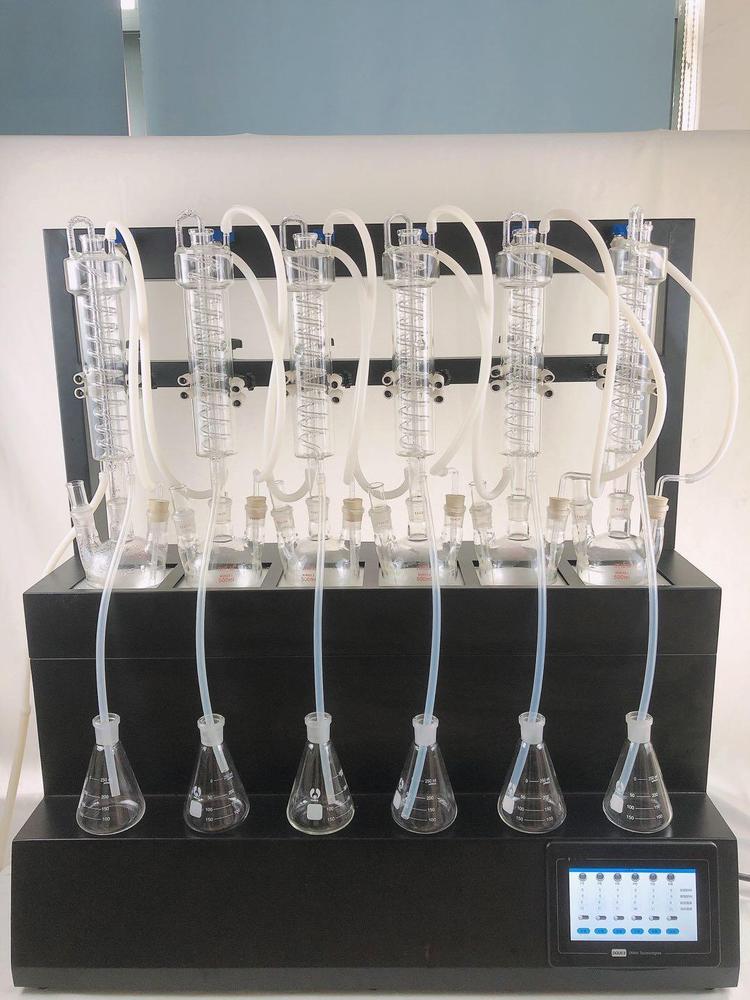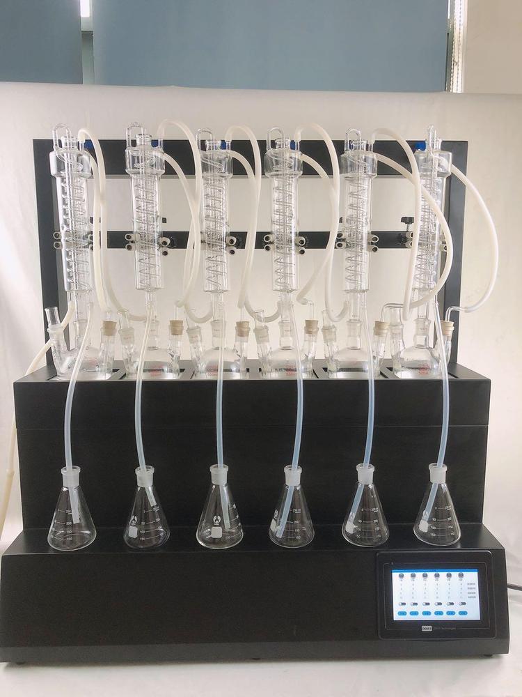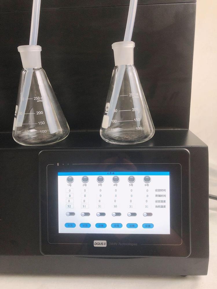 技术参数 Technical parameters 1、加热方式:采用远红外陶瓷加热炉,红外线辐射加热(无明火加热、防水2、加热单元:6个,可单孔单控制;3、升温时间:5-8min;4、蒸馏速度:12ml/min;5、蒸馏终点控制:自动侦测蒸馏终点功能,采用称重和时间双重控制,蒸馏体积控制在±2ml之内,自动化程度高;6、单炉加热功率:0-450W(单孔可调);7、加热功率:0-2700W(可调);8、冷却方式:封闭式内循环回流系统,无需外接冷却水源;9、防倒吸:设有防真空电磁阀,具有防倒吸功能;10、时间控制:0-200min可调;11、蒸馏瓶规格:500mlX6,250 X6 更多规格可选;12、额定电压/频率:220V/50HZ;