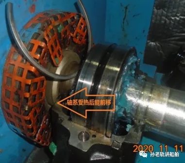 用手盘车偏紧,检查定距环1、2,用手无法将定距环取出(正常状态应该是用手轻轻可以将两定距环取出),由此可初步判断是轴承座安装位置不当引起的高温。于是我们将轴承座的左右两侧定位销取出,取定位销时偏紧。