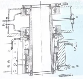 润滑周期为3个月,注入SHC460美孚润滑脂时,先清洁油嘴,从排气孔A拆下塑料集油盒的溢油管,从油嘴I向个轴承加注润滑脂直到从排气孔A有油被挤出,打开排气孔B用B的丝堵堵上排气孔A,继续对油嘴I加注润滑脂直到排气孔B有油被挤出,然后在从油嘴Ⅱ对第二个轴承加注润滑脂直到从排气孔B有油被挤出,然后打开排气孔C用C的丝堵堵上排气孔B,继续对油嘴Ⅱ加润滑脂直到排气孔C有油被挤出,打开排气孔A并安装集油盒A上的溢油管,用A的丝堵上排气孔C,要使轴承和轴承室充满润滑脂,必须定期对轴承组重新加润滑脂以弥补运行中的损耗,为确保新加润滑脂均匀分布在全部空间,每次加油时应按下列步骤润滑-运转-润滑-运转,需要大轮转8圈分四步进行润滑,加入新的润滑脂并排出旧的润滑脂,将从泄油孔中挤出的油平摊在一块布上仔细观察,如果出现金属颗粒,则可能意味着轴承已出现磨损,必须拆下轴承组进行修理(或更换)。