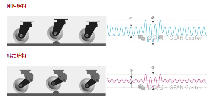 不难发现,轮面的材质、硬度、回弹性及减震部件的选择,都是影响减震脚轮使用效果的关键因素。所以,除了合理的选型工作之外,我们会通过选择不同规格,不同弹性特征的减震部件来获得不同的减震效果,从而满足客户对不同负载、不同初始与减震负荷的要求。