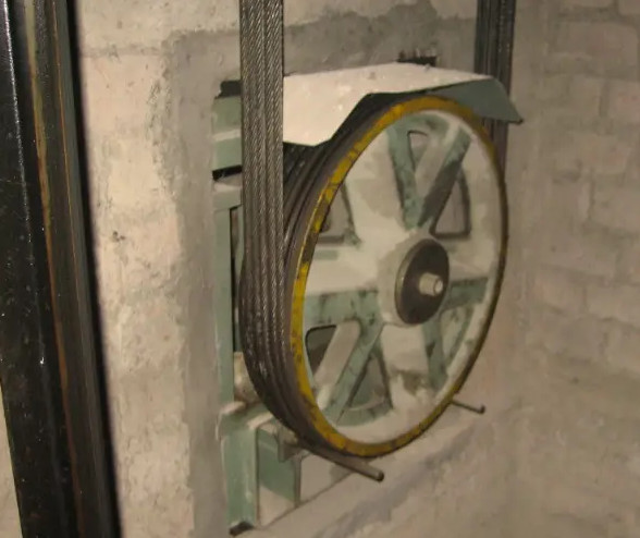 3、 拆除曳引轮防护罩及防钢丝绳防跳装置,松脱曳引轮上主钢丝绳。