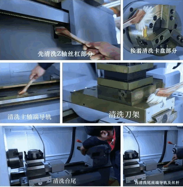 1.将毛刷沾洗油,均匀涂抹在防锈剂表面,机床有防锈剂覆盖的位置都要涂抹到。先清洗Z轴丝杠部分—接着清洗卡盘部分—清洗主轴端导轨—清洗刀架—清洗台尾—再清洗尾座端导轨及丝杠。