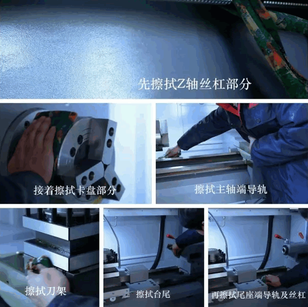2.待防锈油稀释软化后用干净的清洁布擦拭,注意及时更换清洁布。先擦拭Z轴丝杠部分—接着擦拭卡盘部分—擦拭主轴端导轨—擦拭刀架—擦拭台尾—再擦拭尾座端导轨及丝杠。