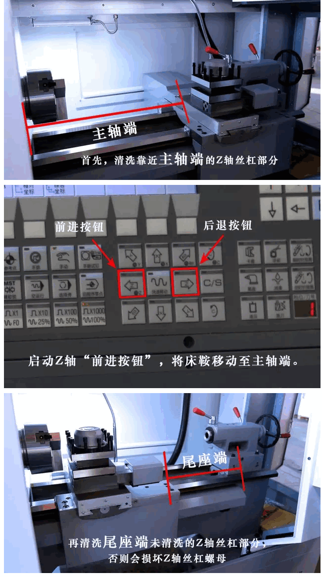 Z轴丝杠被床鞍分为两个部分:首先,清洗靠近主轴端的Z轴丝杠部分,待清洗完成后,启动Z轴“前进按钮”,将床鞍移动至主轴端。