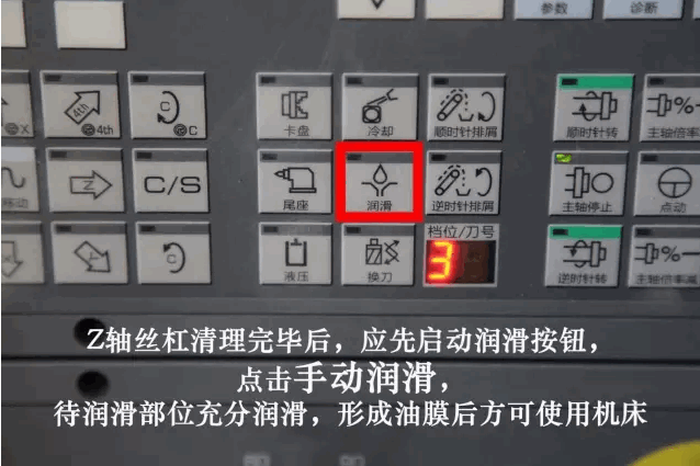 4.Z轴丝杠清理完毕后,应先启动润滑按钮,点击手动润滑,待润滑部位充分润滑后方可使用机床。