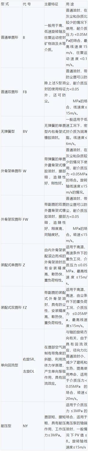 油封的常用材料有:丁腈橡胶,氟橡胶,硅橡胶,丙烯酸酯橡胶,聚氨酯,聚四氟乙烯等。选择油封的材料时,必须考虑材料对工作介质的相容性、对工作温度范围的适应性和唇缘对旋转轴高速旋转时的跟随能力。一般油封工作时其唇缘的温度高于工作介质温度20~50℃,在选择油封材料时应予注意。详情请参照:橡胶种类及特性。油封的工作范围与油封使用的材料有关:材料为丁晴橡胶(NBR)时为-40~120℃,亚力克橡胶(ACM)-30~180℃,氟橡胶(FPM)-25~300℃。