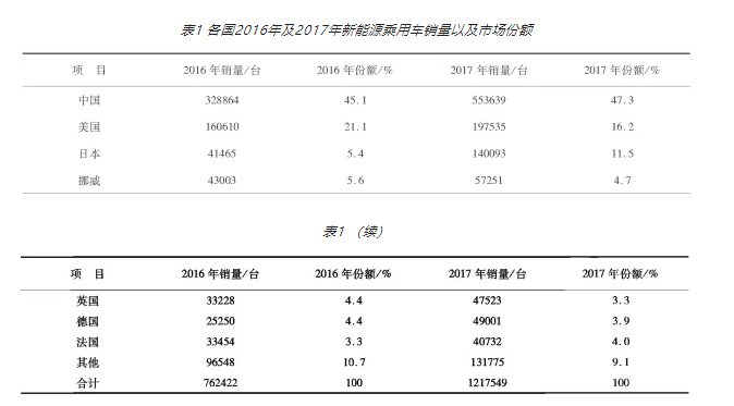 各国2016年及2017年新能源乘用汽车的销量及见表1, 2017年中国新能源乘用车销量,达55.36万台左右,比例达47.3%;美国新能源乘用汽车销量位列第二, 为19.75万台左右,较2016年有所回落;日本的新能源乘用汽车销量位列第三,为14.01万台左右,2017年较2016年大幅度增长,这得益于日产的NOTE增程式电动车市场销量增加。