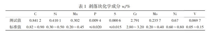 化学成分在剥落块上切取试样进行光谱成分分析,该轧辊材质为8Cr3NiMoV。检测结果见表1,除Cr元素略低于下限,其它成分均在标准GB/T1299-2014范围内。使用洛氏硬度计测试剥落块硬度,硬度(HRC)值达到64.5,且试样上各位置较均匀,符合标准要求。