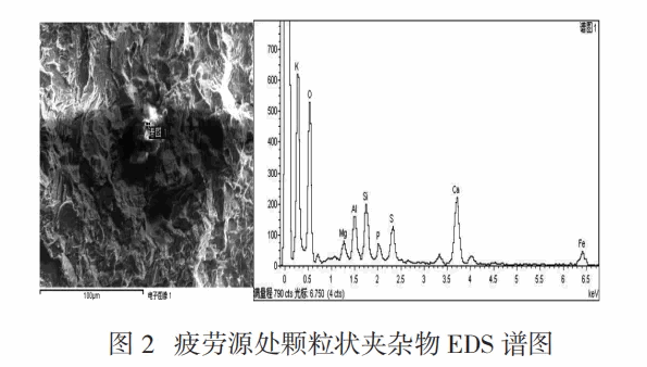 使用扫描电镜观察疲劳源区域发现,存在直径约50μm颗粒状夹杂物,EDS结果显示其含有Ca、K、O、Mg、Al、Si等元素(见图2),为大颗粒氧化物混合型夹杂物。