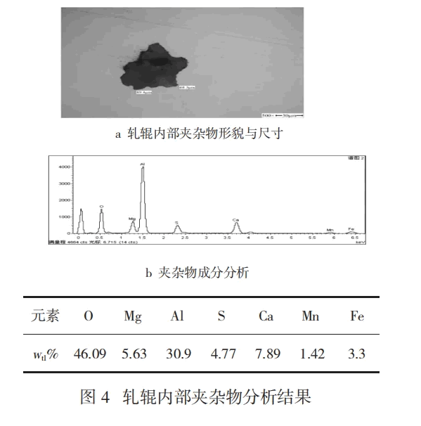 全面观察试样发现,剥落块中存在较多的块状夹杂物(见图4a),尺寸达90μm,夹杂物严重超标。使用扫描电子显微镜能谱分析(见图4b),块状大颗粒夹杂物主要为O、Al,少量Mg、S、Ca、Mn、Fe,可以推断是以Al2O3为主要成分的混合型夹杂物。可能是生产轧辊时熔炼工艺控制不严所致。