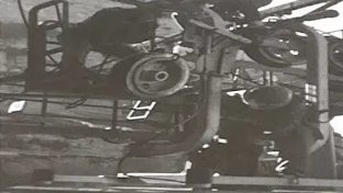 用绳子一边固定住侧板上的另一个索轮,防止索轮摆动。另一边固定住被更换的索轮,用活动扳手将轮轴上的螺母拆卸下来,手锤轻敲击轮轴使其退出,然后用绳子将索轮缓慢下放到吊厢顶部。(见图2)