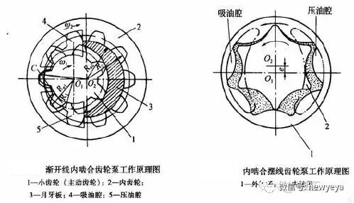 目前常应用的内啮合齿轮泵,其齿形曲线有渐开线齿轮泵和摆线齿轮泵(又名转子泵)两种,它们的工作原理和主要特点与外啮合齿轮泵基本相同。小齿轮为主动齿轮,按图示方向旋转时,齿轮退出啮合容积增大而吸油,进入啮合容积减小而压油。在渐开线齿形内啮合齿轮泵腔中,小齿轮和内齿轮之间要装一块月牙形隔板,以便把吸油腔和压油腔隔开。摆线齿形内啮合齿轮泵的小齿轮和内齿轮相差一齿,因而不需设置隔板。内啮合齿轮泵的结构紧凑、尺寸小、重量轻、运转平稳、流量脉动小、噪声小,在高转速下工作时有较高的容积效率。由于齿轮转向相同,因此齿轮间相对滑动速度小、磨损小、使用寿命长。但齿形复杂,加工困难,价格较外啮合齿轮泵高。
