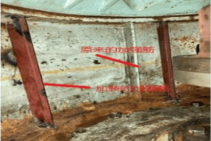 3.减少泵的振动。俗语云:基础不牢,地动山摇。泵架是用钢板弯曲成圆形、两端加盖钢板烧焊而成的,上、下有两个大孔,用于装马达并固定在水泵上。泵架前、后(艏艉方向)开了两个大小不一的检查/检修方孔,用于拆装联轴节和盘车,两端钢板之间由四条加强肋板支撑,以增强上盖板的支撑力,承受马达的重量。有些船舶是在马达的吊孔环位置加固,方法是通过两根带可调节的撑杆,一端固定在墙壁上或其它结实牢固的地方,一端通过螺栓连接到马达的吊孔环,通过转动调节头而使撑杆顶住马达,但作用/收效甚微。