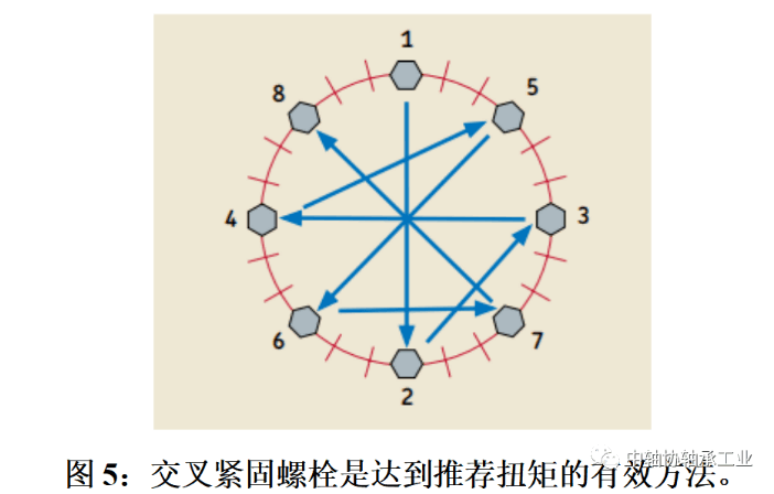 所有螺栓应按照设备设计者的指示拧紧,以限度地减少过早磨损、设备损坏甚至受损的可能性。螺栓预紧力应分三个阶段进行——设备设计师最终设计预紧力的30%、80%和99%——使用交叉紧固螺栓的“星形”技术(见图5)。定期检查螺栓预紧力。