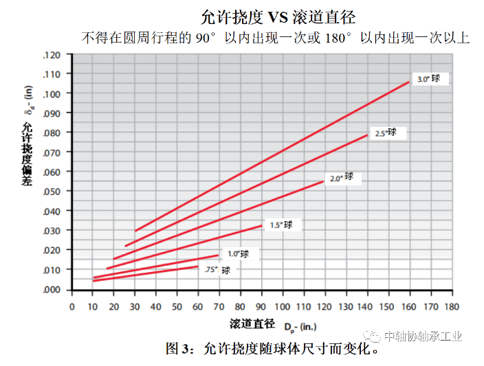 安装结构挠度是另一个重要因素。有限元分析(FEA)是一种很好的评估方法,但应通过测试(如千分表)确认结果,以确保其在轴承制造商的限制范围内。还应测试轴承在载荷下的挠度。图3显示了四点、八点球轴承的典型容许安装结构挠度,作为轴承变桨和球体直径的函数。有关替代设计,可请咨询轴承制造商。