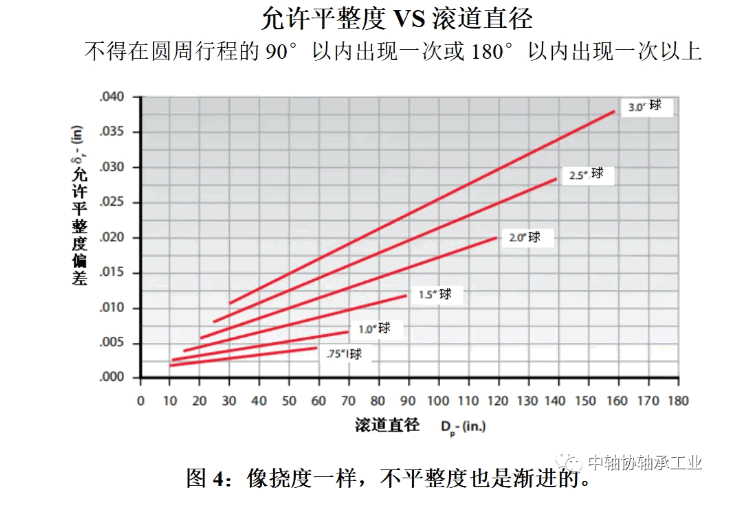 图4显示了四点、八点球轴承的典型允许安装面不平整度与轴承节圆直径、球体直径的函数关系。超出制造商规定的平面度会导致高摩擦扭矩,并相应缩短轴承寿命。