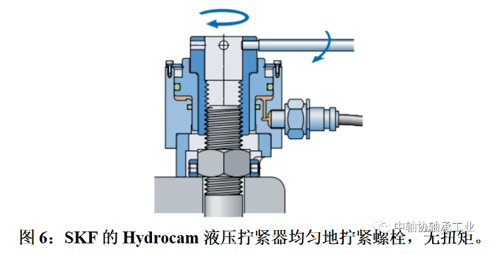 所有螺栓应使用校准设备精确拧紧。两个常见的例子是扭矩扳手或液压螺栓拧紧器,以避免过度拧紧。例如,SKF的Hydrocam螺栓拧紧器(图6)专门设计用于将螺栓安装在转盘轴承上。它确保所有螺栓上的预紧均匀,优化屈服强度,有四种不同的设计可供选择。