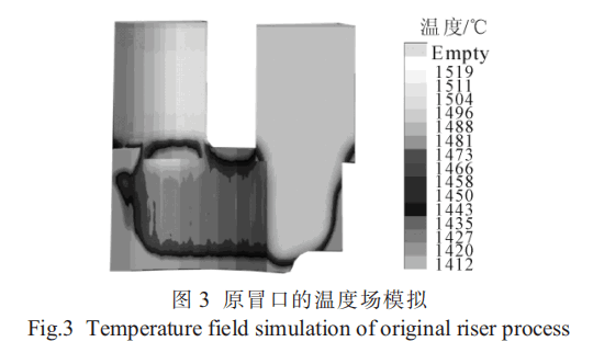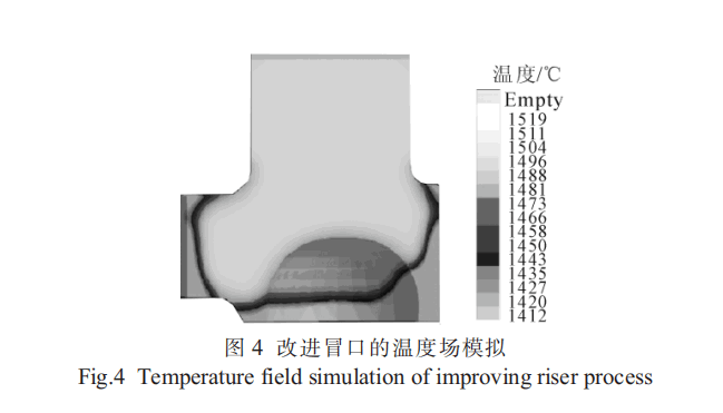 凝固模拟可以预测铸件的缩孔、缩松的位置,有利于铸造工艺验证和优化,对降低生产成本和提高铸件质量方面起着很大的作?。针对轴?座改进前和改进后的冒口工艺方案,利用MAGMA凝固模拟软件分别进行模拟分析,其模拟结果见图3、图4。通过模拟结果的对比分析:改进冒口的方案更有利于冒口的集中补缩,冒口中的钢液更能长时间地保持在高温状态,使冒口与铸件之间形成了明显的温度梯度,实现铸件的顺序凝固,提高了冒口的补缩效果。