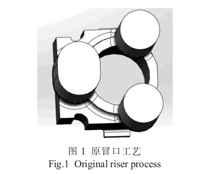 分散冒口的工艺方案生产 4 件轴承座,超 声波探伤合格率低,其中 3 件轴承座在两个冒口之 间发现缺陷,距离分型面100~150 mm范围内。经分析缺陷为缩松, 生产时采用焊接的方式进行修 复,但是缩松缺陷的焊接难度大,大大增加了生产成本,同时也面临着铸件报废的风险。