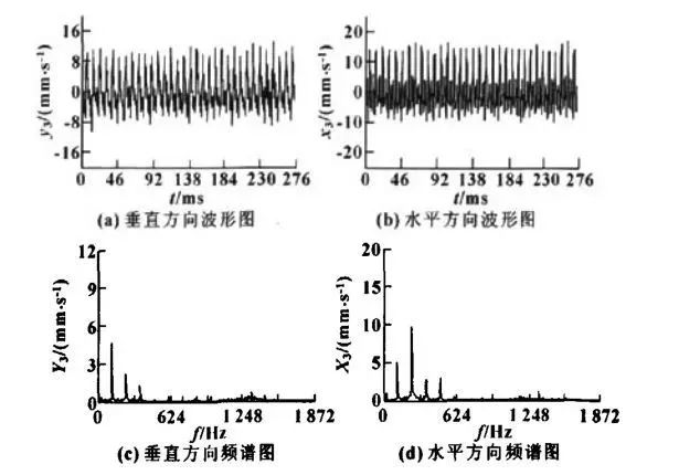 从图4的波形频谱图上,可以很明显的看出不对中故障的振动特征,基本判断出是测点3处轴承在水平方向上轴承不对中,因此,首先应该检测测点3处轴承对中问题。