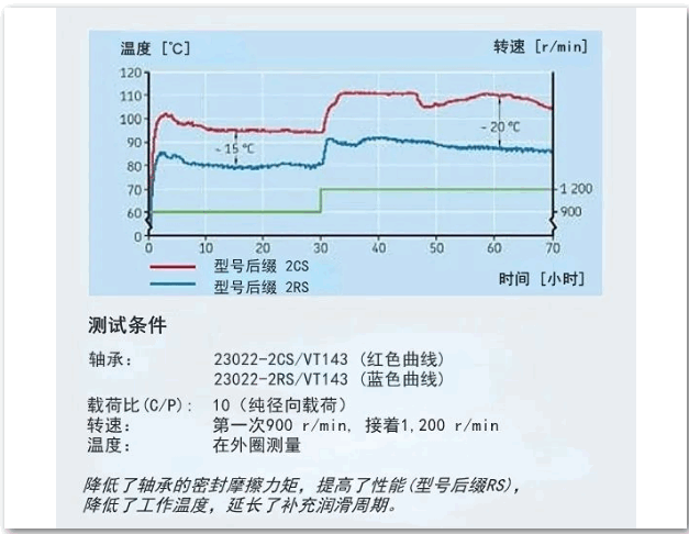 当所选的密封球面滚子轴承运行在高速条件下时,保证工作温度不超过密封材料的建议温度很重要。标准丁腈橡胶材料(后缀RS)的极限温度为90℃,氢化丁腈橡胶材料(后缀RS5)为150℃。降低轴承密封的摩擦力矩可减少发热,从而相应地降低工作温度。在典型运行条件的测试中,带有新设计密封的轴承温度下降约15至20℃(图4)。在实际应用中,较低的工作温度意味着润滑脂老化速度减缓,相应的补充润滑周期变长。工作温度降低15℃,补充润滑周期会翻倍。延长补充润滑周期另外一个好处是,更多轴承在运行中无需补充润滑。