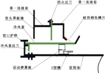 风箱式窑头密封装置冷风套喇叭门同样向窑尾方向敞开,风箱冷风嘴整圈布置,冷风360°密封冷风套,窑口护铁360°整圈冷却,窑头密封靠鱼鳞片装置密封,鱼鳞片自密封,使用寿命长,内置双道密封环(见图4)。