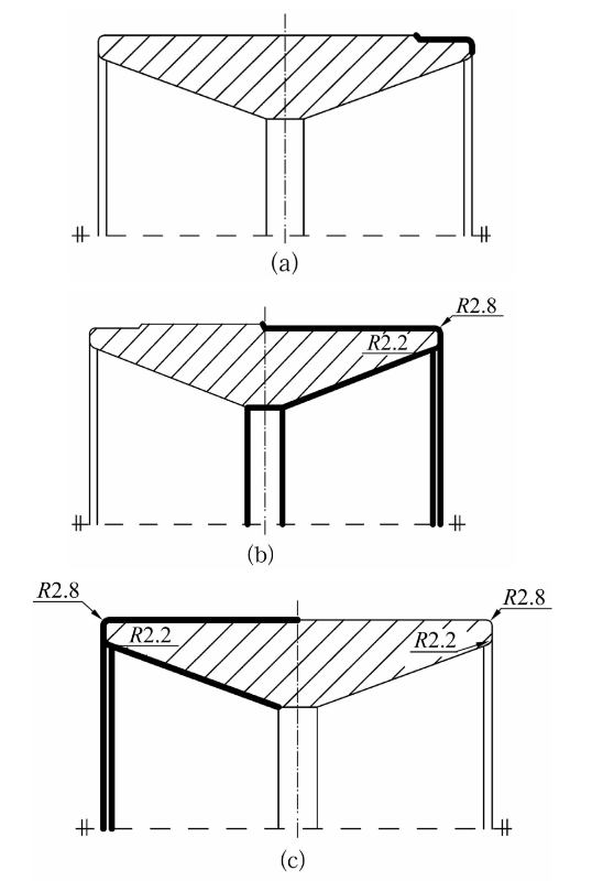 1)优化工艺流程。第1次车一端外径面时不加工到工艺尺寸,仅作为夹持基准,夹持已车外径面加工另一端面到工艺尺寸,再夹持已车到工艺尺寸的端面加工另一端面到工艺尺寸,由于外径面已车过一次,消除了锻件外径面的形状超差,几何形状基本可以控制。改进后的工艺流程为车端面、外径面(图4a)→车端面、外径面、滚道面、外内径面及倒角(图4b)→车端面、外径面、滚道面及倒角(图4c)。改进后的工艺增加了2次夹持定位基准,可有效消除形状超差。