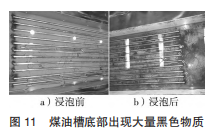 针对分配器(含内置、外置分配器)的维护与REBS技术人员沟通,正确的维护清洗方式是:将各分配器在煤油槽中浸泡2d,浸泡后煤油槽底部出现大量黑色物质(图 11)。然后用清洁压风正、反向吹扫后,再到新煤油中冲洗即可。另外,内置分配器短节连接处的O形圈在每次修复时均需更换新件。