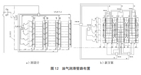 目前新设计的油气润滑管路布置方案为:取消内置分配器,增加二级外置分配器,通过不锈钢管路(Ф6mm×1.5mm)直通每个润滑点(图12b)),新方案优点如下: