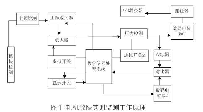 图1中清晰的描绘了轧机故障实时监测工作原理。模块检测需要与轧机轴承链接在一起,通过收集轧机轴承相关频 率,通过放大器、压力感应器等进行物理转换,将故障内容转换长数字信号,然后通过对比器以及跟踪器对故障内容进行对比与追踪,从而确定轧机轴承的故障情况。数字信号处理系统是一个自动化的故障处理系统,通过将常见轴承故障进行编码,从而判断出轧机故障的实施情况。