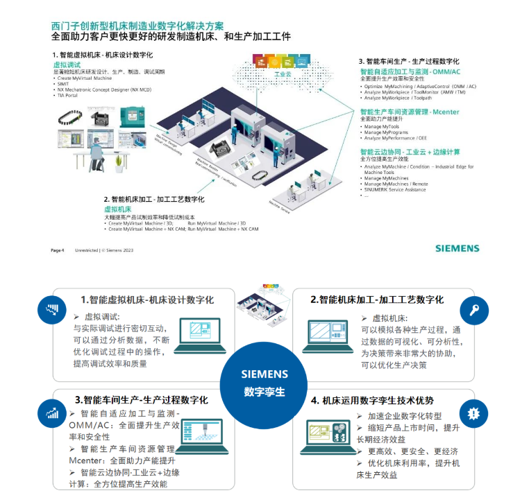 例如,在产品研发阶段,西门子One数控系统能够助力机床制造商缩短机床设计时间和现场调试时间,提升机床研发、上市效率。面向机床用户,西门子One数控系统的机床虚拟加工解决方案可实现对加工工艺、加工速度、加速度、节拍时间等方面的仿真验证,帮助客户大幅缩减试切时间和试切成本,并规避碰撞风险。目前,一些大型机床企业已经开始试用西门子One的虚拟调试系统,实现了从840Dsl到One的移植和机床调试。