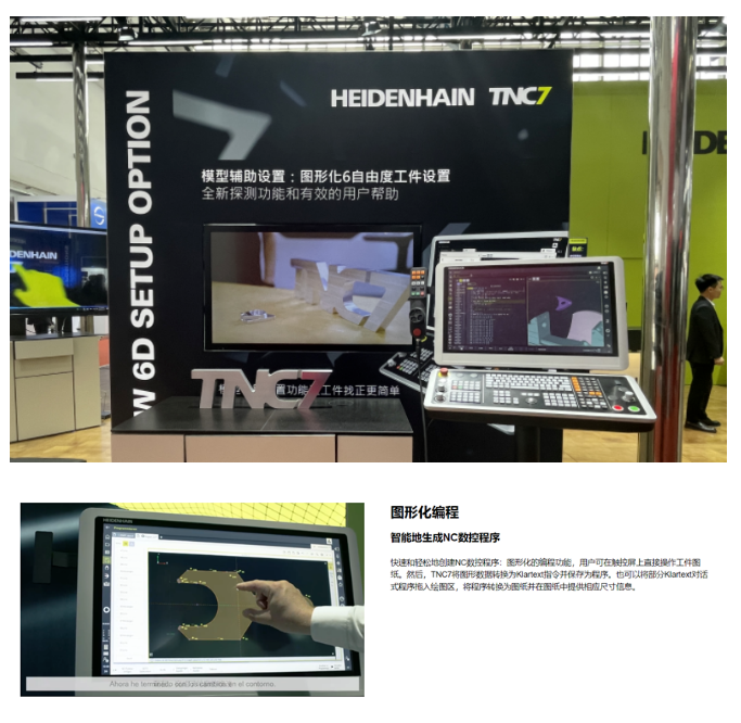 海德汉重点展示了新款TNC7数控系统,该数控系统具有图形化编程功能,能够快速编写复杂工件加工程序。其智能化功能主要包括:智能偏差测控、智能磨损检测、智能反向间隙补偿、智能机床前端点控制、智能图形化编程、智能函数、智能动态碰撞监测等。