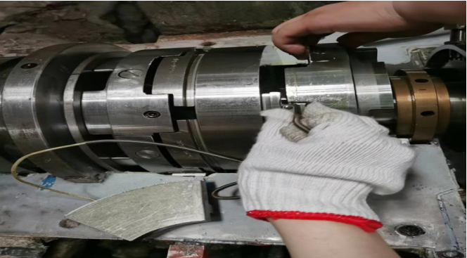 瓦温传感器选型不当一会导致监控系统对瓦温的监测不可靠,很有可能在机组异常运行,瓦温不断升高的情况下,不能及时采取有效的保护动作,发生烧瓦事件;二会导致传感器根部容易断线,传感器信号线缆长期泡在油中,并且在小机工作时会承受不同方向的油流推力。更换瓦温传感器是件耗时耗人力的工作,需要停运隔离小机,揭开前箱,翻出推力瓦,拆除毁坏传感器及其布线,安装新传感器和重新布线。整个工作工期时间长,停运机组时间长,对机组运行有很大的影响。因此,推力瓦瓦温传感器的正确选型,传感器的可靠稳定,对机组的安全可靠运行具有重要意义。本机组小机推力瓦瓦温我们根据现场安装条件,选择的是φ6mm的单支PT100热电阻,延长线直径φ2.5mm,在温度外线处套入弹簧条,有效地保护了电缆,提高了传感器的可靠性,对机组的调试和可靠运行提供了保障,已这种选型及安装方式,近年来未出现过断线现象。现场情况如下图: