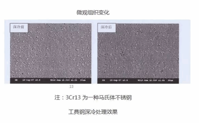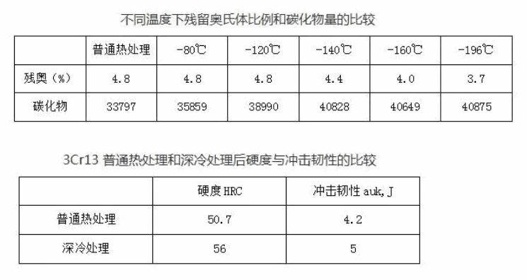 通过深冷处理使金属内大部分残余奥氏体转变成高强度的马氏体,并析出大量超细碳化物颗粒,可以使整个金属的强度增加,耐磨性增加,韧性增加,稳定性增加,寿命成倍增加。