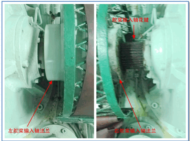 2018年4月13日,大管轮在做设备检查时发现右舵桨输入轴法兰向外滑移,见下图左右机对比,整个输入轴法兰几乎要脱落状态(如下图)。