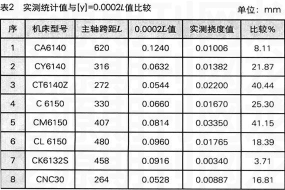 为了便于分析,特选已进行挠度计算的八台车床为例,进行实测挠度值与许用值[y]=0.0002L值作一比较,得到表2结果。