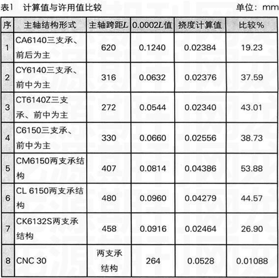 通过计算得出典型主轴端部挠度计算结果详见表1,并与[y]=0.0002L许用值作比较。