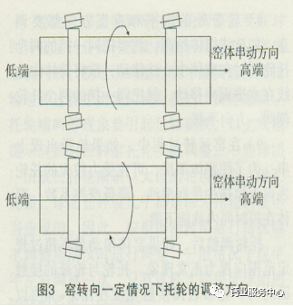 控制回转窑下串就是通过将托轮调斜的办法来达到控串的目的,即根据窑的回转方向,把托轮轴线调斜一点,使其与窑轴线呈微小偏角,这就是控制回转窑下滑的基本原理。根据回转窑转向调整托轮的正确方向如图3所示。