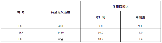 在中国测试技术研究院的监测下,我们用本企业WC基ZT15材料与瑞士SKF,德国FAG,日本NSK6005轴承材料进行了上100次的对磨试验。试验结果如下表。