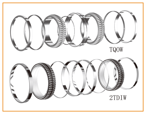 铁姆肯公司直孔四列圆锥滚子轴承目前主要有两种结构形式,即TQOW、2TDIW结构形式,主要用于工作辊径向位置支撑。这两种类型的轴承内圈均为直孔、预设内部游隙、润滑油由外圈隔环进油孔与油槽进入轴承内部,轴承滚子采用面对面安装形式。TQOW与2TDIW结构形式的区别主要是:TQOW型轴承外圈由两个单外圈、一个双外圈与两个外圈隔环组成,而2TDIW型轴承外圈由四个相同单外圈与三个外圈隔环所组成。对于同一系列并相同滚子数量的TQOW或2TDIW结构形式,轴承的承载能力相同。